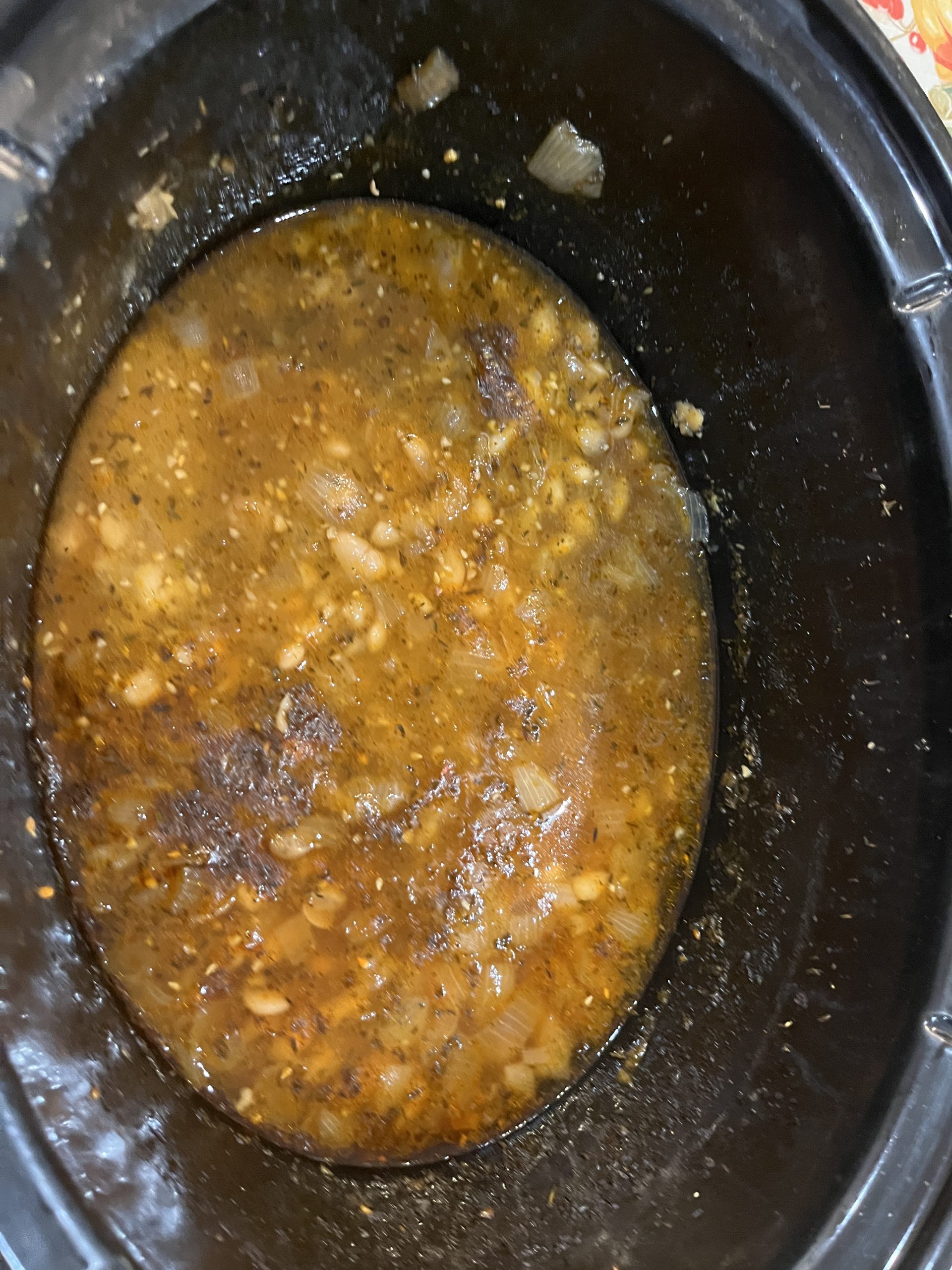 • To the beans add ham bone, onion, all spices to the slow cooker.