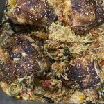 - Season chicken with salt, pepper, and 1 1/2 tablespoons paprika. In a large skillet over medium-high heat, heat 1 tablespoon olive oil. Sear chicken skin-side down until golden, about 6 to 8 minutes. Flip and cook 3 minutes more, then transfer to a plate skin-side up; set aside.