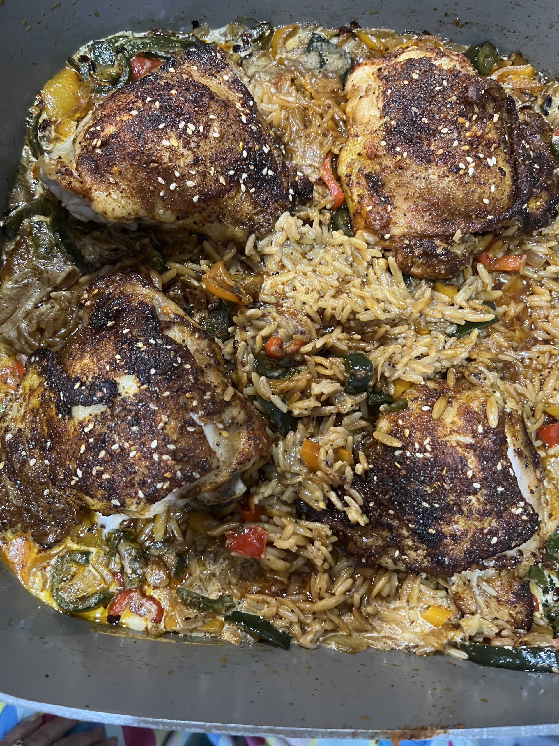 - Return pan to heat and heat remaining oil. Add garlic and cook until fragrant, 1 minute. Add peppers and cook until slightly tender, 4 to 6 minutes. Season with salt, pepper, and remaining paprika. Add rice, chicken broth and heavy cream and bring to a simmer. Return chicken to skillet and cover. Simmer until rice is tender and chicken is cooked through, about 20 minutes.