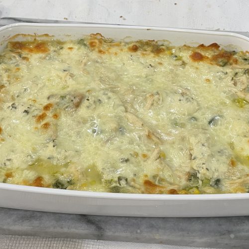 Remove the chicken to cutting board and let it cool. when it's cool enough to handle, cut the chicken lengthwise into thick strips and layer in the bottom of casserole dish.