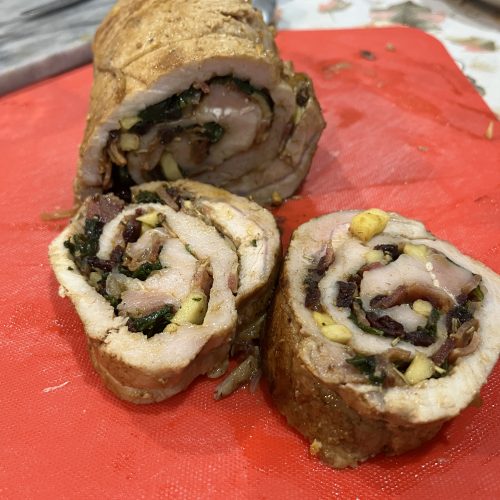 Remove the cooked loin from the oven and use a large spoon to baste it with the broth from the pan. Baste it for a few minutes, then remove the stuffed pork loin onto a carving board. Let the loin rest for at least 15 minutes, to 30 minutes.