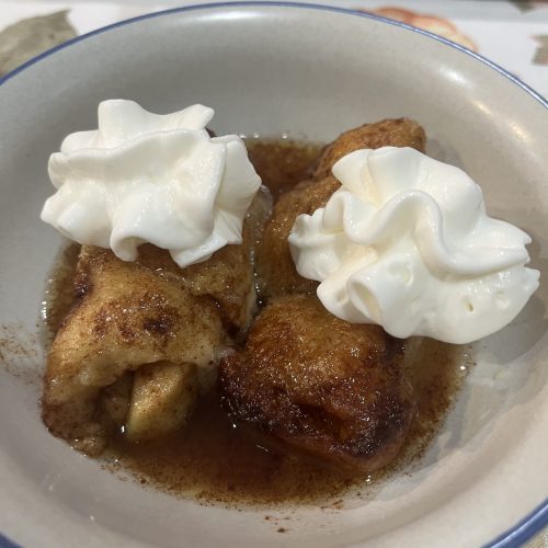 This dessert recipe involves wrapping Granny Smith apple slices in crescent roll dough, then baking them in a rich buttery sauce made with sugar, cinnamon, vanilla, and Mountain Dew. The soda adds a unique citrusy sweetness and helps create a caramel-like glaze as it bakes.