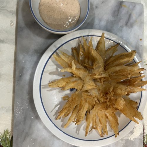 Just a flavorful as the blooming onion, but easier to do. Do in small batches and adjust the spiciness level to your guests taste.