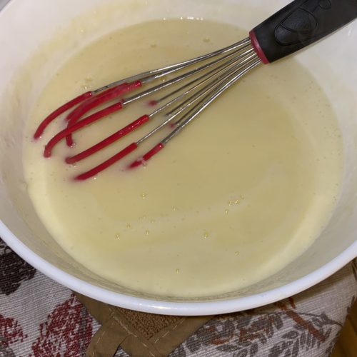 Whisk in cream and reduce heat to low. Simmer mixture, whisking occasionally, until liquid is reduced to about 3 tablespoons. Mixture can be prepared up to this point as much as 1 day ahead, covered, and refrigerated.