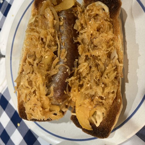 Drain the sauerkraut and add it to the skillet, along with the caraway seeds, paprika, pepper, and chicken broth. Stir to combine with the apples and onions. Nestle the browned bratwurst down into the sauerkraut.