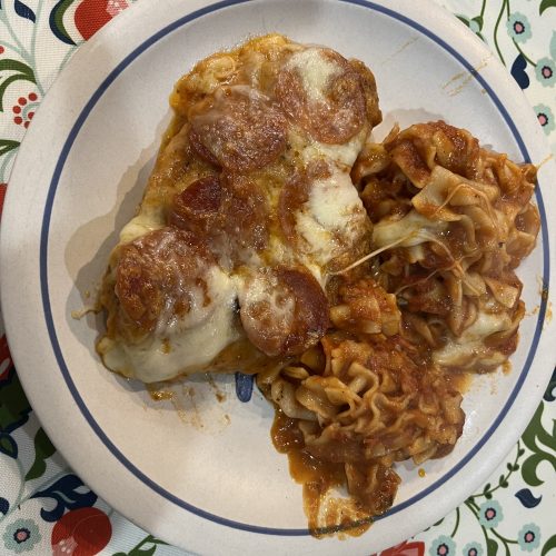 Top each piece of chicken with three slices of pepperoni and a large handful of cheese using all of it. Pop back into over and bake/broil until cheese has fully melted, about 5-8 minutes. Watch carefully as all oven behave differently.