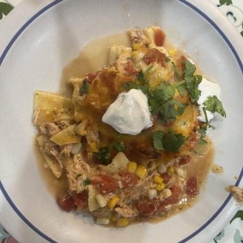 Raise the oven temperature to 400 degrees F. Remove the foil and sprinkle the top with the remaining cheese. Continue to bake until the cheese is melted and just starting to brown, about 10 minutes. Top with dollops of sour cream and sprinkle with the red onion and cilantro. Serve hot.