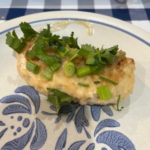 Add garlic and saute until soft and fragrant. Add a little chicken broth to de-glaze the pan, being sure to scrape up the brown bits on the bottom of the pan.