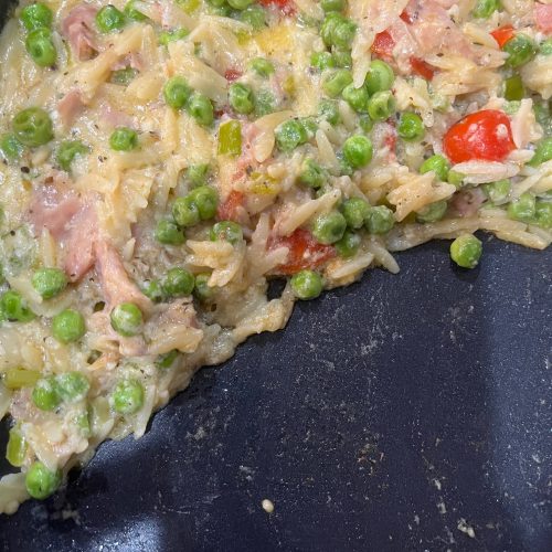 Creamy Orzo with Prosciutto and Peas is a delicious and easy-to-make pasta dish that features orzo, a small rice-shaped pasta, combined with a creamy sauce, salty prosciutto, and sweet peas. This savory and satisfying meal can be served as a main course or a side dish and is perfect for a cozy weeknight dinner or a special occasion.