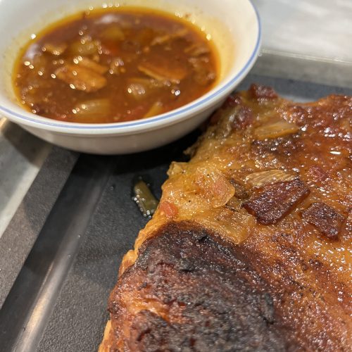 Make the bacon BBQ sauce. Meanwhile, preheat a large Dutch oven over high heat. Cook the bacon until golden brown and crisp. Add the diced onions to the pan and cook until tender (about 6 minutes) then add the garlic and cook an additional 2 minutes. Stir in the tomatoes, chili sauce (or ketchup), brown sugar, molasses, beef stock, and the remaining salt/pepper/garlic mixture. Bring to a simmer.