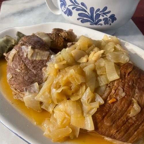 Slice the pot roast and, using a slotted spoon, spoon the onions over the top, followed by some of the gravy. Serve with extra gravy on the side.