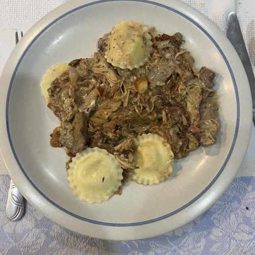 Remove the onion mixture from the oven. Using a kitchen towel to protect your hands, squeeze the garlic from the peel, directly onto the onion mixture. Add the Boursin (or cream cheese) cheese and stir to combine. Add in the hot pasta and touch of the starchy pasta water, if needed.