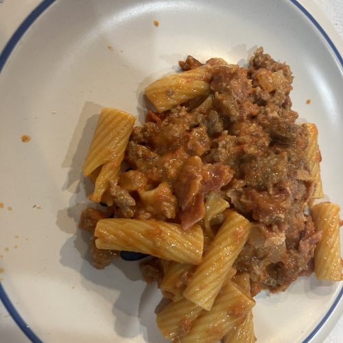 Meanwhile, in a pot of lightly salted boiling water, cook pasta until softened on the exterior, but well shy of al dente, and still uncooked in the center (about 3 minutes less than the package directs). Using a spider skimmer, transfer pasta to sauce, along with 1/2 cup pasta cooking water. Transfer an additional 1/4 cup pasta cooking water to bowl with reserved egg yolk-Parmesan paste, and stir with a rubber spatula until smooth and well-combined; set aside. Alternatively, if you don't have a spider skimmer, drain pasta using a colander or fine-mesh strainer, making sure to reserve at least 1 1/2 cups pasta cooking water, before proceeding with above instructions.