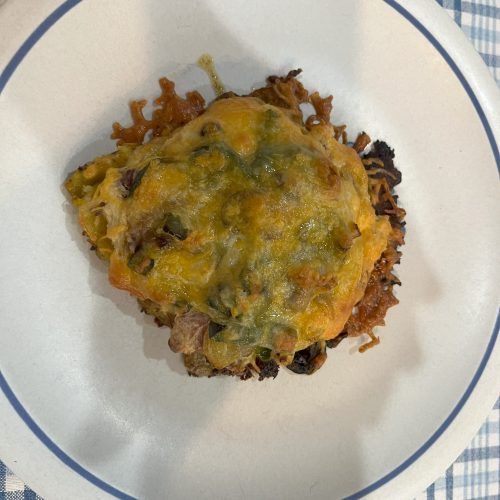 Top with chicken mixture, pepper and onion mixture & cheese.