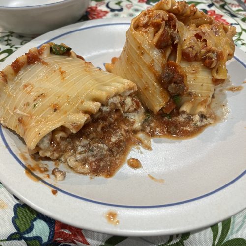 Lay half of the cooked lasagna noodles on a clean work surface and spread 2 heaping tablespoons of the ricotta mixture evenly over each. Starting with a short end, roll each noodle up and transfer to the prepared baking dish seam-side down. Repeat with the remaining noodles and ricotta mixture. Spoon the remaining sauce over the lasagna rolls and sprinkle with the remaining 1 cup mozzarella and 1/3 cup Parmesan.