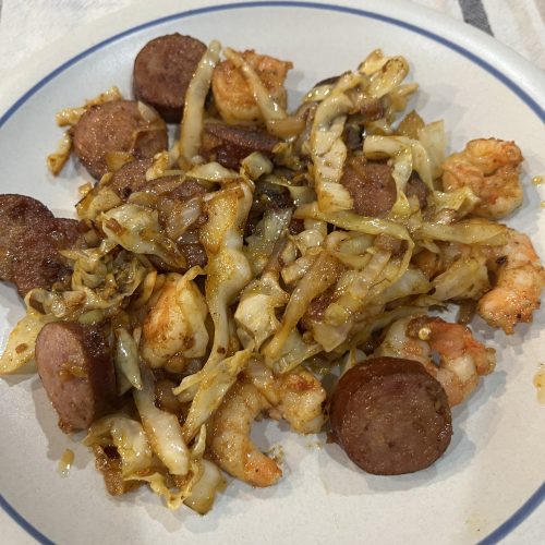 Return sausage to the pan and add shrimp. Cook for another 3–5 minutes, until shrimp are pink and cooked through.