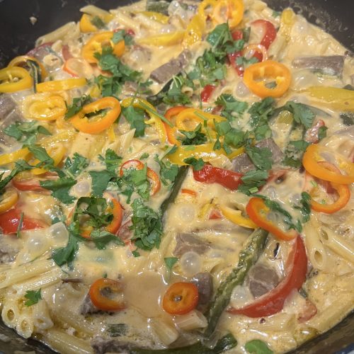 Add the drained pasta to the sauce and toss to combine. Transfer to bowls and garnish with fresh cilantro and a few reserved mini pepper rings.