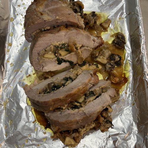 Imagine a succulent pork loin, expertly seasoned, butterflied, and generously filled with a savory stuffing of your choice. Whether it's a delightful blend of herbs, breadcrumbs, and aromatic spices or a decadent mixture of fruits and nuts, the stuffing infuses the pork loin with layers of taste and texture. Roasted to perfection, the pork loin emerges from the oven golden brown on the outside, juicy and flavorful on the inside, creating a visual and gastronomic spectacle that leaves a lasting impression.