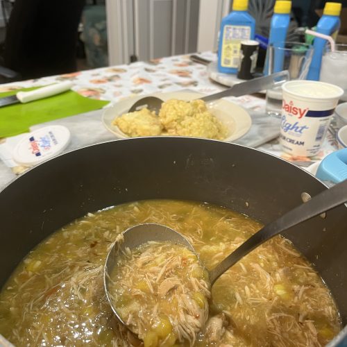 What sets this White Chicken Chili apart is the addition of cornbread dumplings – soft, fluffy morsels that absorb the savory flavors of the chili while adding a delightful hint of sweetness. It's a comforting bowl that hugs your senses, offering a perfect balance of textures and tastes in every spoonful.